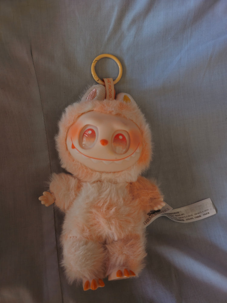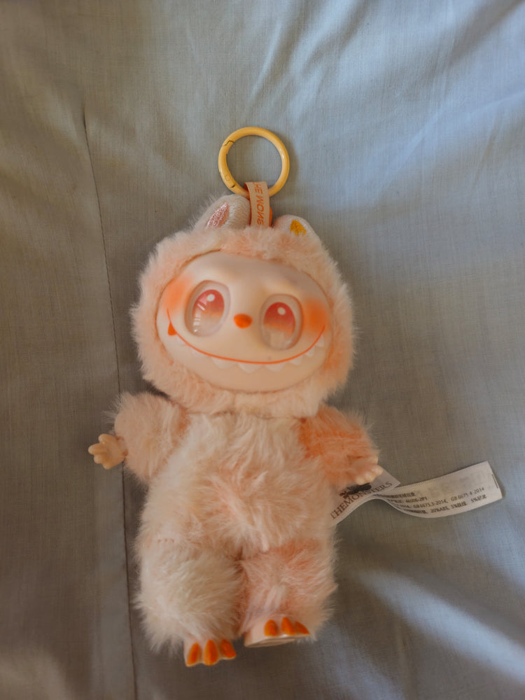 Design Unico e Dettagliato: Labubu Happiness è un personaggio che unisce il fascino misterioso di Labubu con un look morbido e sognante. Il corpo è avvolto da una tuta integrale in morbido peluche color rosa pesca, che crea un effetto caldo e avvolgente. Le orecchie e il nasino sono in tono con la pelliccia.