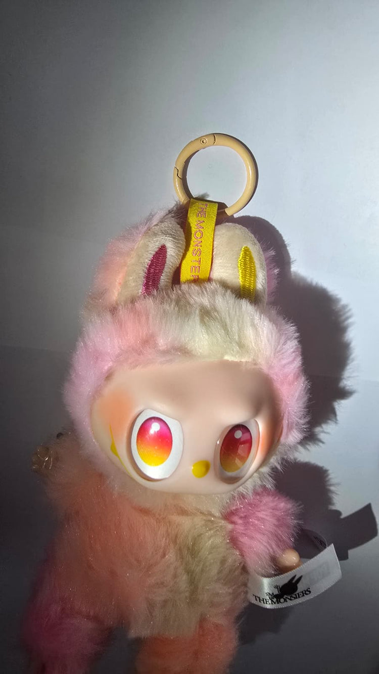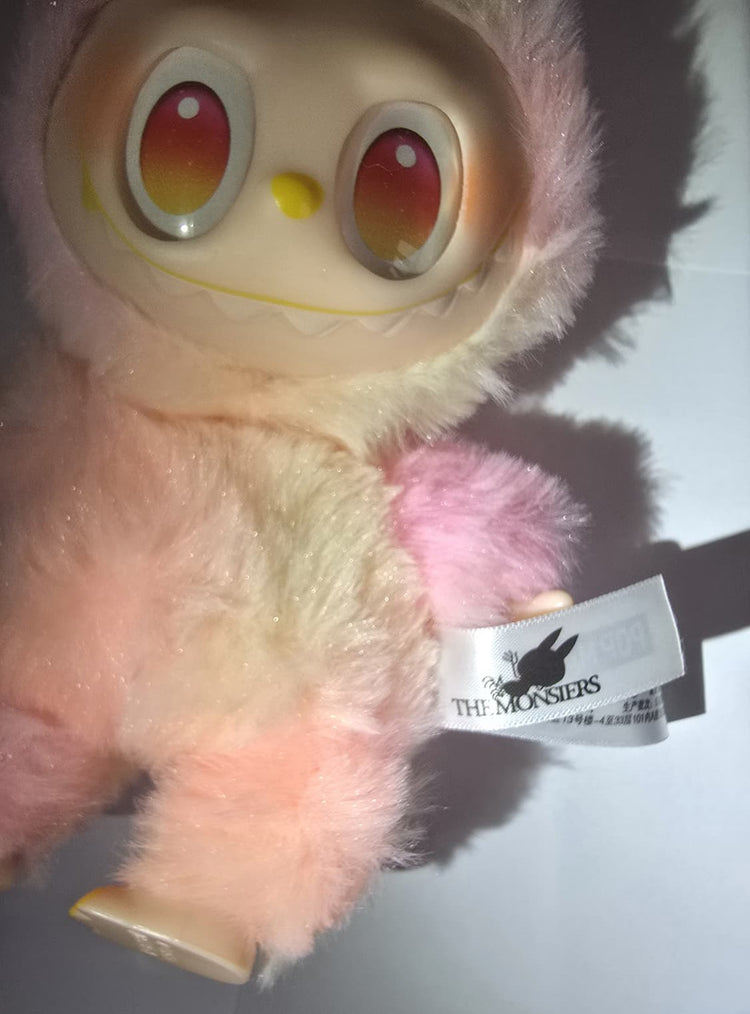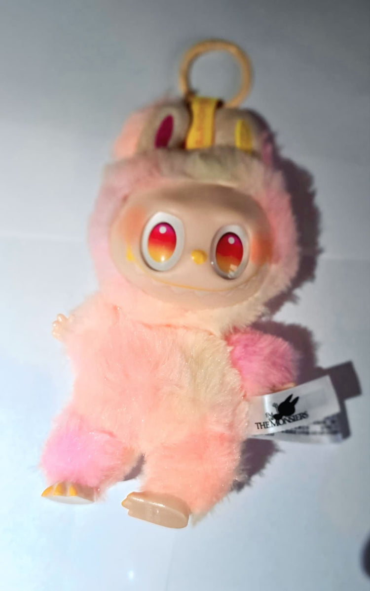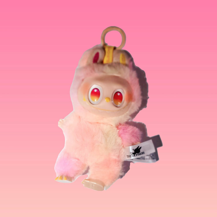 Design Unico e Dettagliato: Labubu Loyalty è un personaggio che unisce il fascino misterioso di Labubu con un look morbido e sognante. Il corpo è avvolto da una tuta integrale in morbido peluche color rosa e arancione sfumato, che crea un effetto caldo e avvolgente. Le orecchie e una corona dorata aggiungono un tocco di regalità al personaggio.