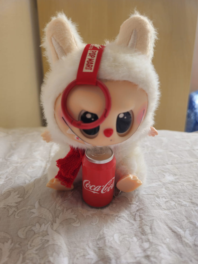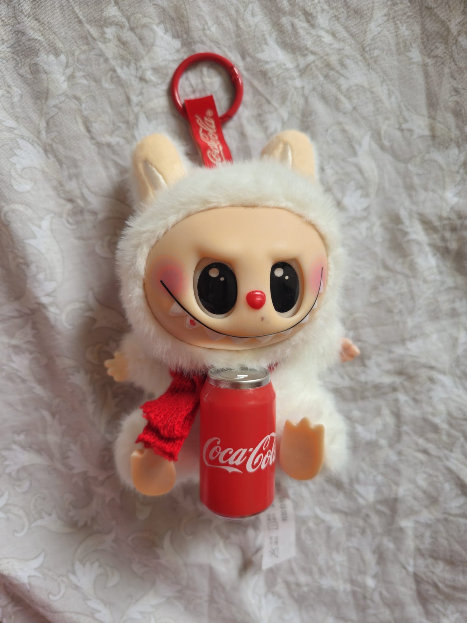 • Design Unico a Tema Coca-Cola: Il Labubu indossa una tuta integrale in morbido peluche bianco, che evoca un senso di comfort e purezza. Le orecchie sono in tono con la pelliccia, mentre il viso tipico di Labubu, con gli occhi grandi e l'espressione birichina, è messo in risalto.