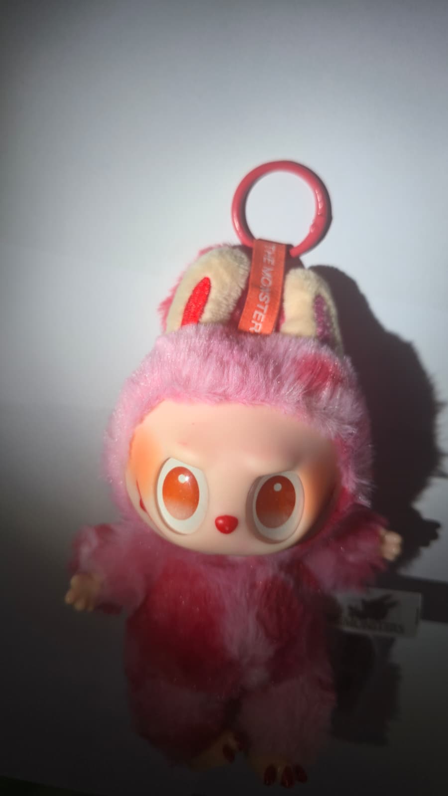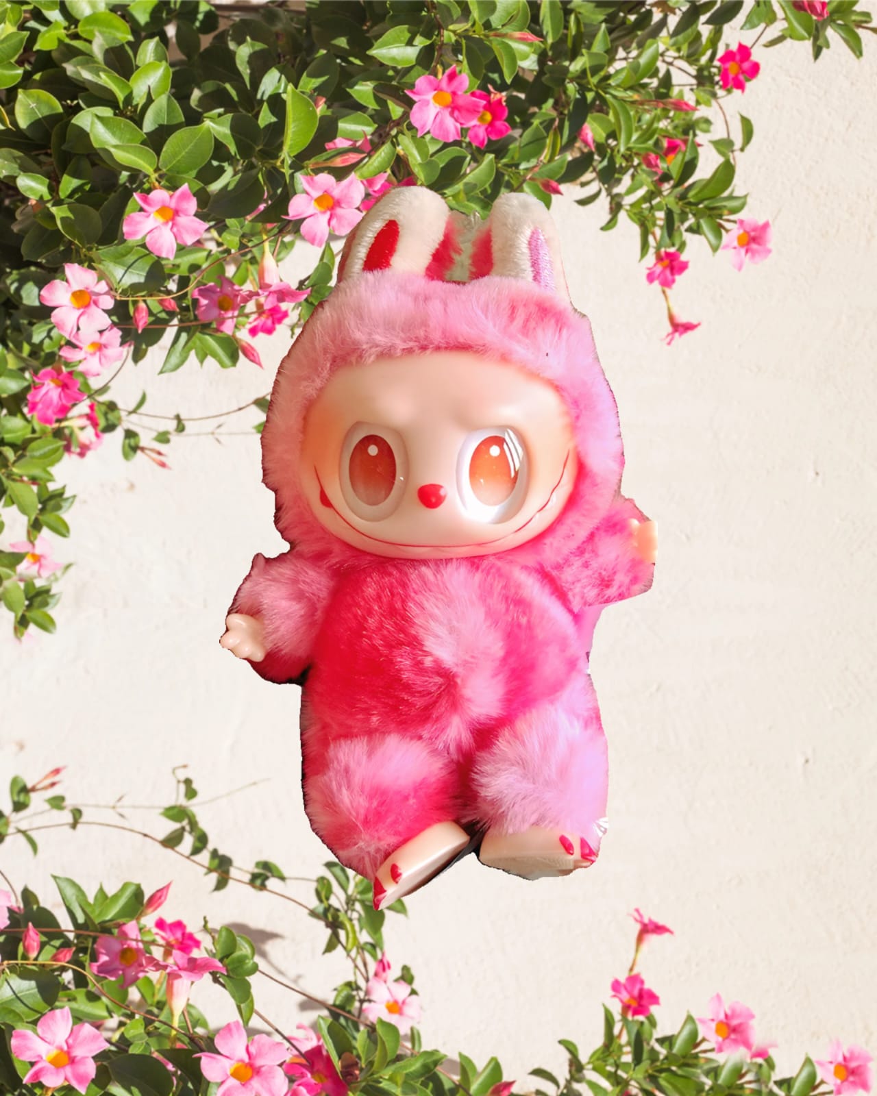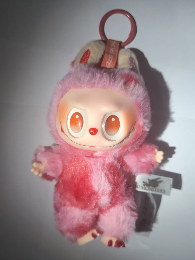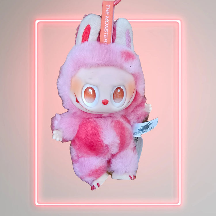 Design Unico e Dettagliato: Labubu Love è un personaggio che unisce il fascino misterioso di Labubu con un look morbido e sognante. Il corpo è avvolto da una tuta integrale in morbido peluche rosa a strisce più chiare, che crea un effetto caldo e avvolgente. Le orecchie e il nasino sono in tono con la pelliccia.